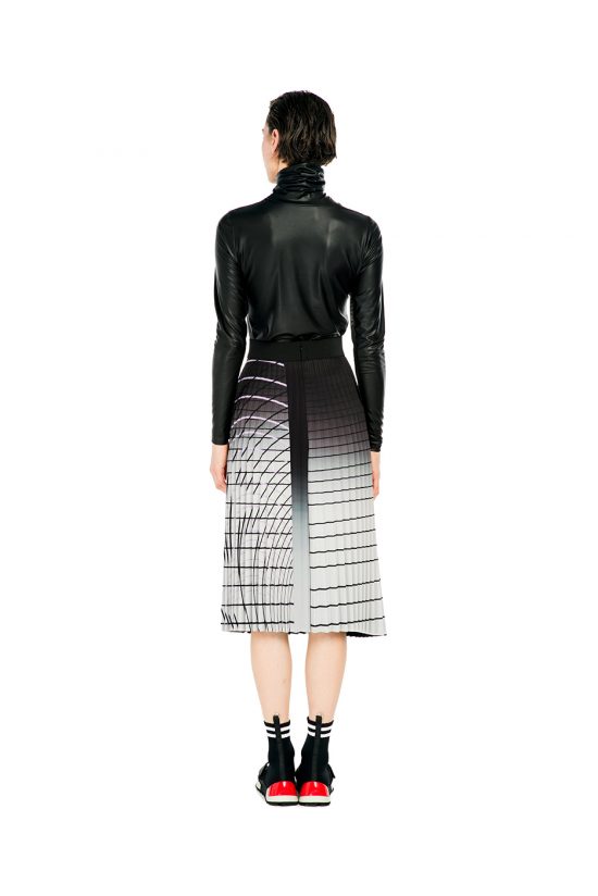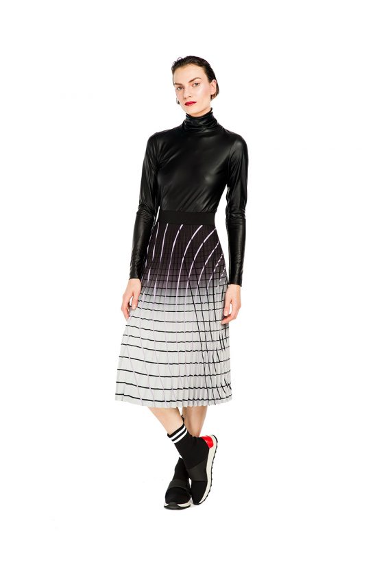 ANGEL to ręcznie plisowana solejka z nadrukiem łączącym dwie oddalone od siebie historie malarstwa ściennego. Starożytny pompejański rysunek węża połączony został z nowożytną figurą Anielicy. Wzór został zaprojektowany do solejki ANGEL. Dwa osobne przedstawienia łączy nieśmiertelna czerń, stanowiąca ramę i obrazu i solejki. tym razem spódnica ma duży odpinany od góry i od dołu czarny dekoracyjny zamek kostkowy. Możesz sama regulować jak długi chcesz mieć rozporek. Solejka to spódnica plisowana promieniście. Plisy są węższe u góry i rozszerzają się ku dołowi. Dolny brzeg spódnicy jest cięty laserowo. Spódnica jest na szerokiej 5 cm czarnej gumie, zamek ma z przodu. Nie ma podszewki, jest obszyta lamówką wewnątrz. Proponujemy do tej spódnicy nasz sweter PEARL albo ONYX. Wersja elegancki sweter i kozaki to to co proponujemy jako must have. ANGEL jest tak zaprojektowana, byś mogła nosić ją na rożne sposoby, możesz ją przekręcić i mieć zamek z boku, lub z z tyłu. Ty decydujesz jak ki obraz jest z przodu, a jaki z tyłu. Ta spódnica roztacza przed tobą swoje niemal nieograniczone możliwości.