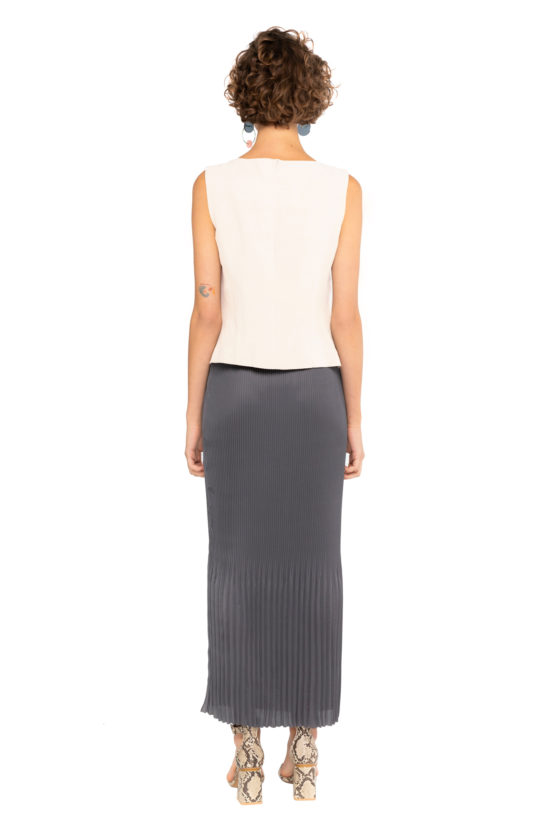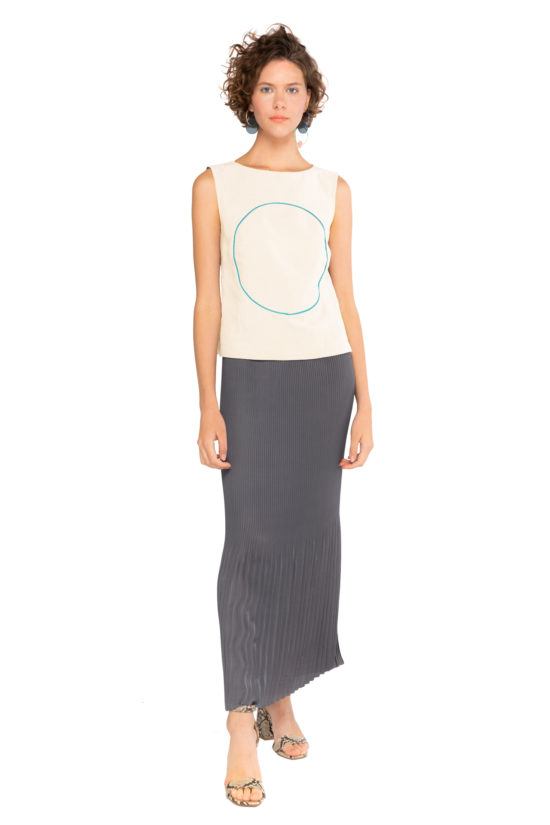 Plisowane, drukowane i cięte laserem spodnie culotte zrobią wyjątkowe wrażenie. Nadruk z przodu spodni inspirowany sztuką abstrakcyjną, zaś nadruk z tyłu to proste cieniowanie, które przez to, że jest ciemniejsze u góry a jaśniejsze na dole, podkreśla jeszcze bardziej fason spodni i wysmukla sylwetkę. Kiedy plisy się rozchylają widzimy niezadrukowany błękitny materiał, co daje dodatkowy ornament i niesamowity efekt przy poruszaniu się. Spodnie mają czarny pasek i dwie kieszenie po bokach. Zapinane są z tyłu na kryty zamek błyskawiczny. Spodnie wewnątrz wykończone są lamówką. Proponujemy do nich naszą bluzkę DOUBLETWIST GREY, a jeśli lubisz fasony bardziej oversize- TWISTED WHITE. Połączyliśmy je tak w lookbooku, ale też doskonale sprawdzą się z granatową bluzą albo TWISTED BLACK czy TWISTED WHITE.