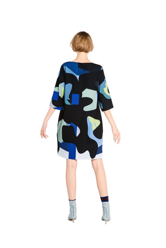 Drukowana sukienka o linii A, przed kolano, z dwoma wygodnymi kieszeniami w szwach bocznych. Sukienka jest nadrukowana w amorficzne wzory inspirowane sztuką awangardy XX wieku. Tkanina została wydrukowana we Włoszech.