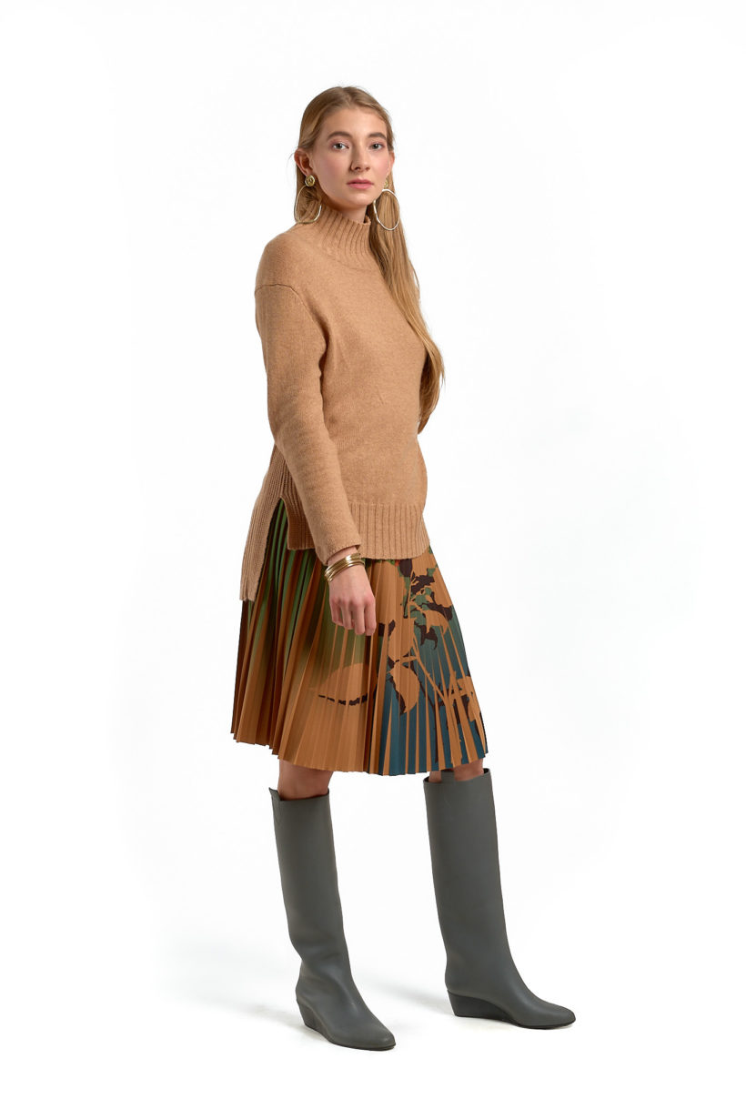 Otulający, miękki sweter JANTAR w odcieniu bursztynu, zrobiony z cienkiej wełny merino, bawełny oraz zmiękczającego włókna nylonu. Prosty, delikatnie oversizowy fason, z tyłu nieco dłuższy, z rozporkami po bokach i wysokim półgolfem. Pasuje do każdej stylizacji. Półgolf z tyłu ma delikatne pęknięcie.