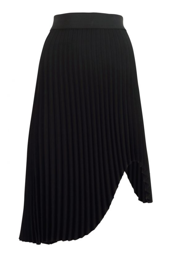 NOIR POWER to czarna, asymetryczna solejka. Solejka to spódnica plisowana promieniście. Plisy są węższe u góry i rozszerzają się ku dołowi. Dolny brzeg spódnicy jest cięty laserowo. Spódnica jest na szerokiej 5 cm czarnej gumie, po lewej stronie ma wszyty kryty zamek. Dłuższy bok spódnicy ma 70 cm. Spódnica nie ma podszewki, jest obszyta lamówką wewnątrz. My proponujemy do tej spódnicy dwuwarstwową bluzę DOUBLE CIRCLE albo naszą oversizową bluzkę TWISTED WHITE lub TWISTED BLACK. Taka solejka doskonale sprawdzi się w miejskiej stylizacji z mocnymi butami i wiosennym płaszczem lub kurtką bomberką. Inna jej wersja to elegancka koszula i szpilki. Naprawdę NOIR POWER roztacza przed tobą swoje niemal nieograniczone możliwości.