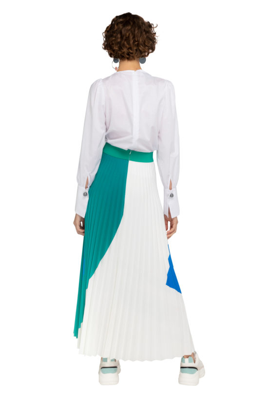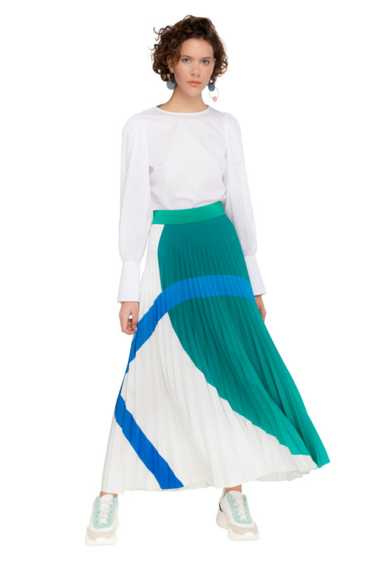 Prosty oversizowy t-shirt z drukowanym wzorem, który powstał we współpracy z artystką i ilustratorką Anną Pol. Bluzka jest z przodu nieco krótsza, nie jest dopasowana w talii. Idealna od dżinsów lub szerokich, prostych spodni. Świetnie sprawdzi się z ołówkową spódnicą, ale dobrze wygląda też z plisowanką. Szerokie  krótkie rękawy można wywinąć, co da dodatkowy efekt.