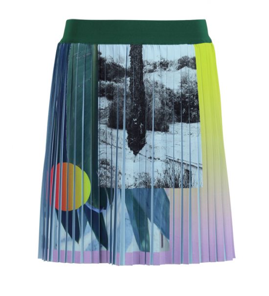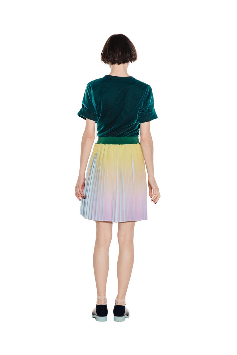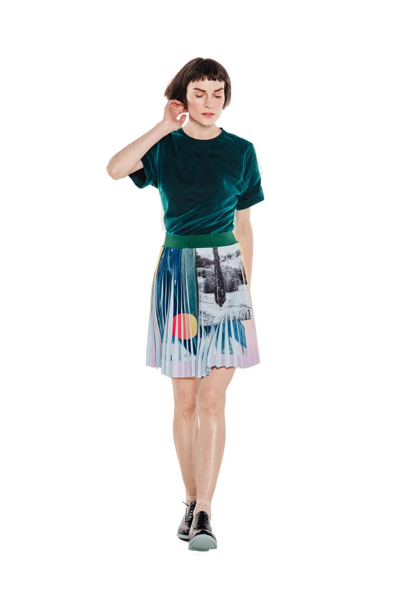 Plisowana, drukowana i cięta laserem mini spódnica. Z przodu ma nadruk tajemniczego ogrodu, na tle zachodzącego słońca. Z tyłu nadruk jest cieniowany, jego kolory to barwy zachodu słońca.  Kiedy plisy się rozchylają widzimy niezadrukowany błękitny materiał, co daje dodatkowy ornament. Spódnica jest na  szerokiej 5 centymetrowej, ozdobnej gumie. Nie ma podszewki, jest obszyta lamówką wewnątrz. Proponujemy do niej naszą bluzę DOUBLE CIRCLE.