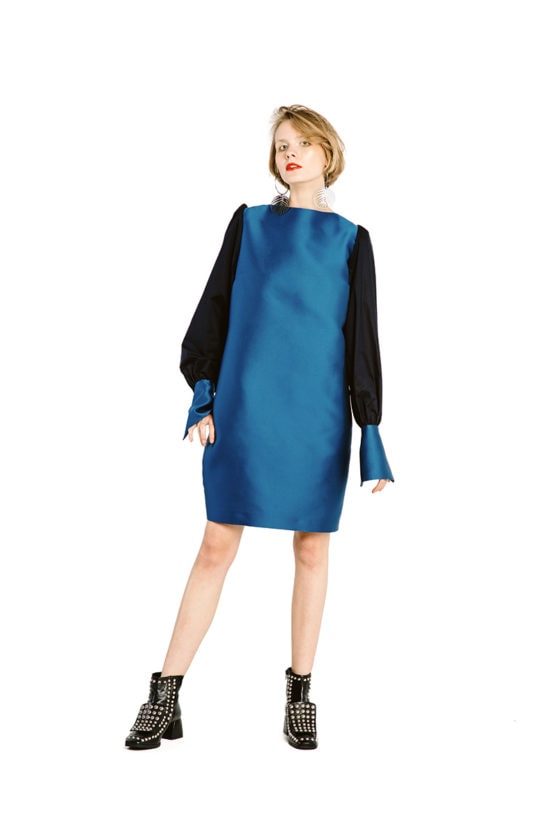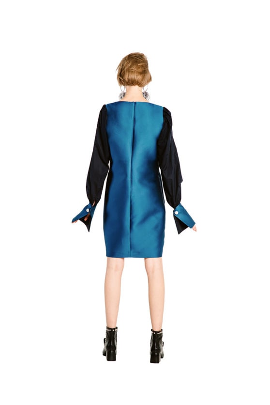 Prosta sukienka z pięknej połyskliwej niebieskiej tkaniny z matowymi, bufiastymi rękawami. Duże mankiety rękawów ozdobione są pokaźnych rozmiarów perłą. Sukienka jest delikatnie dopasowana i ma kuszący łódkowy dekolt. Sukienka nie ma podszewki, szwy wewnątrz są lamowane, ma z tyłu wszyty kryty zamek. Ma dwie wygodne kieszenie ukryte w bocznych szwach.