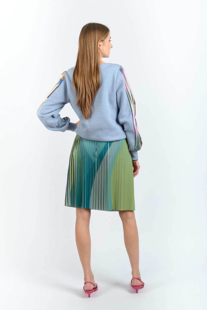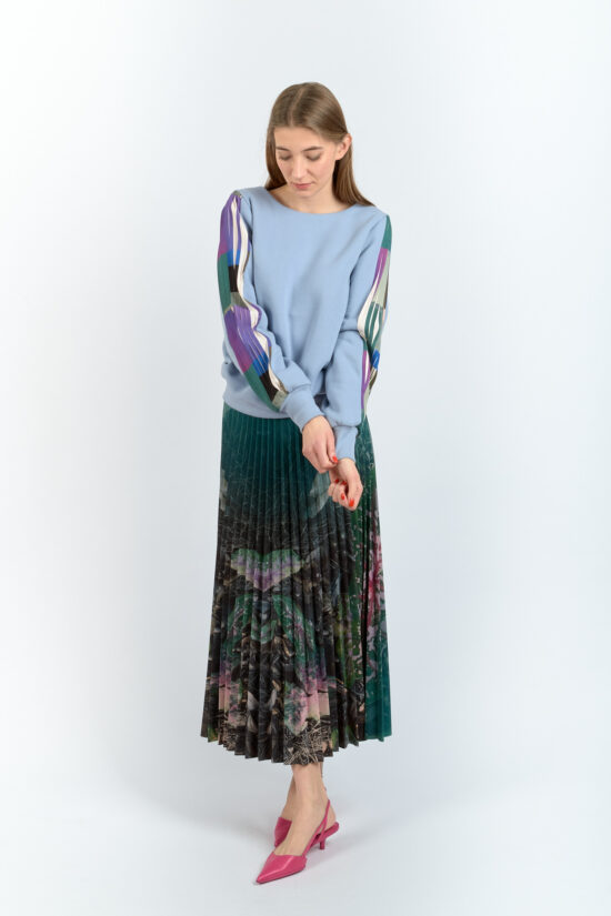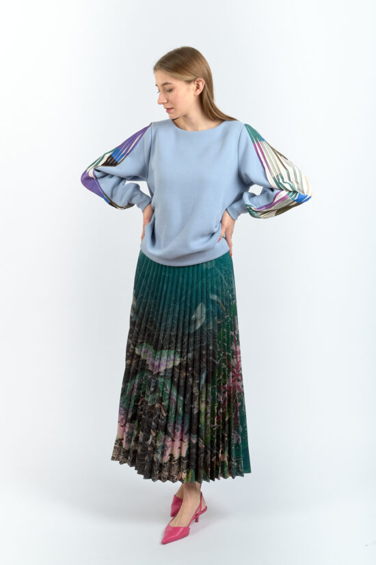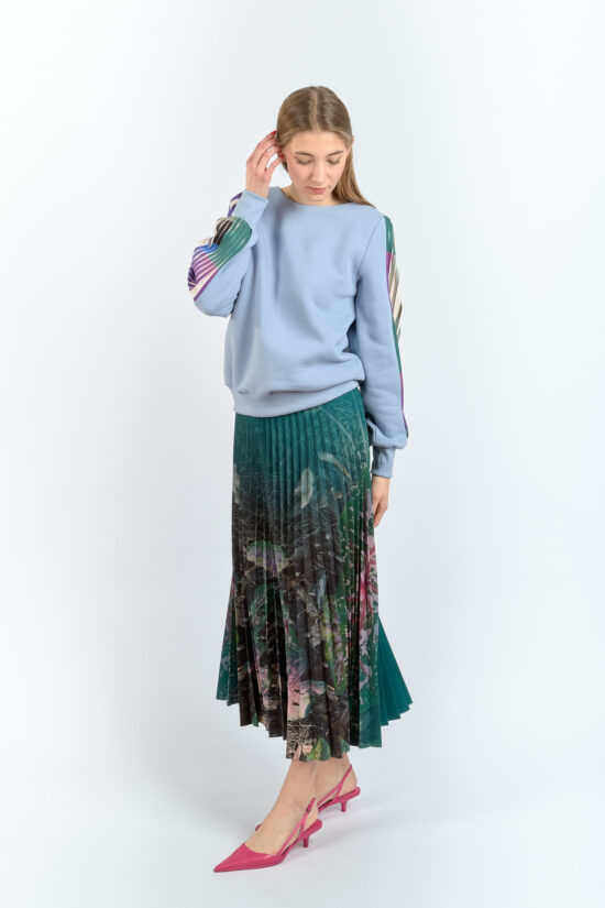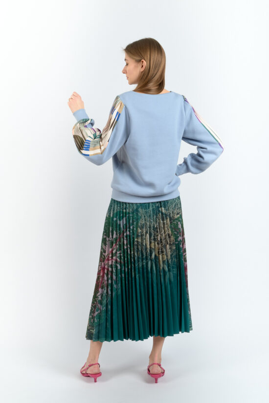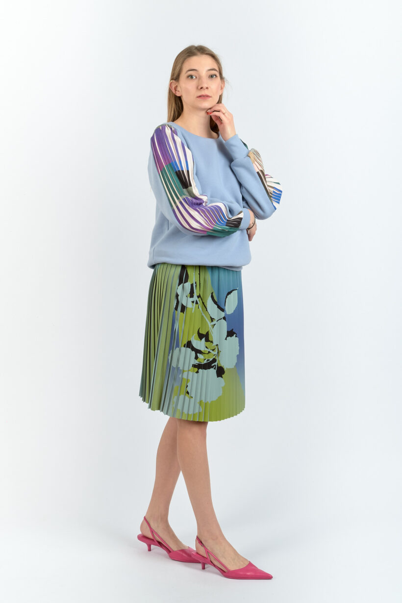 Delikatnie oversizowa bluza z organicznej bawełny i z plisowanej tkaniny w kolorze bladego różu. Splisowana tkanina jest drukowana, co daje dodatkowy wzór. Bluza ma okrągły, łódkowy dekolt co nadaje delikatnie jej mniej sportowego charakteru. Ma też obszerniejsze rękawy z klasycznym mankietem. Bluza fantastycznie sprawdzi się z naszymi plisowanymi spódnicami, chętnie dopasuje się do dżinsów.