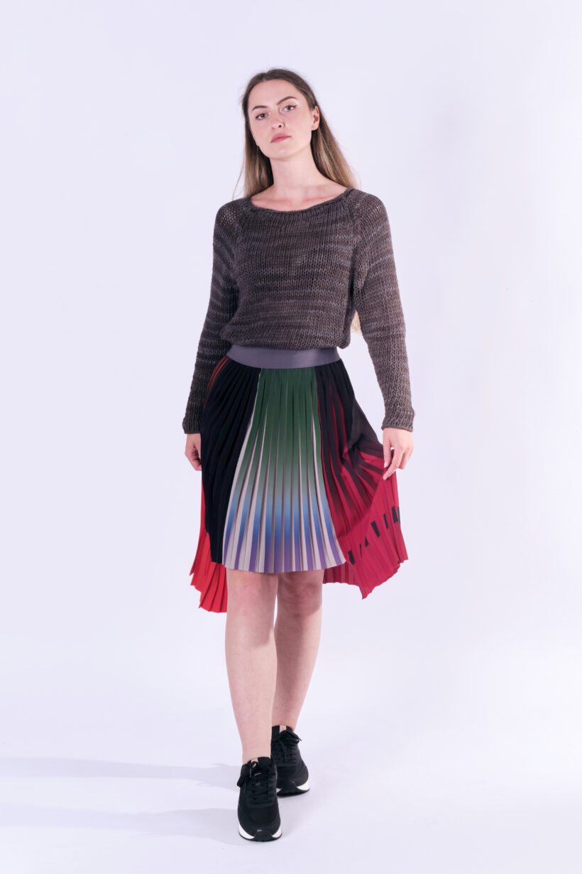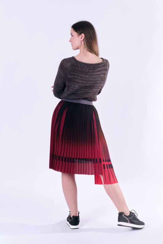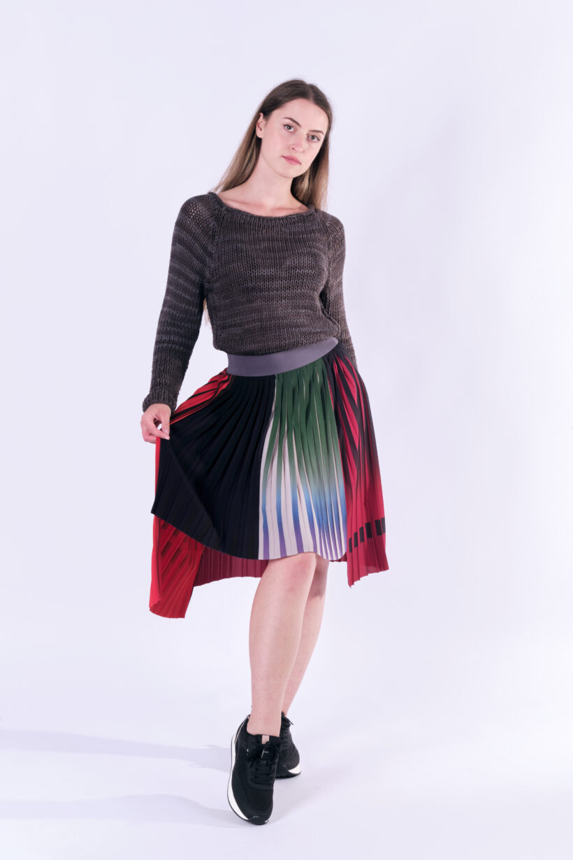 CRAZY to cięta laserem, plisowana, asymetryczna spódnica, uszyta z 4 różnych kolorów, na których nadrukowane są abstrakcyjne obrazy, inspirowane sztuką XX-wiecznej awangardy. Nadruk jest zrobiony na tkaninach w kolorach ciemnej czerwieni, mocnego cynobrowego pomarańczu, ciemnego fioletu i szarości. Kiedy plisy się rozchylają widzimy niezadrukowaną tkaninę, co daje dodatkowy, przestrzenny efekt i tworzy kolejny ornament. Spódnica jest na szerokiej 5 cm ciemno-popielatej (M) lub granatowej (L), ozdobnej gumie. CRAZY nie ma podszewki, jest obszyta lamówką wewnątrz. Asymetryczne długości spódnicy podkreślą twoje piękne nogi. Do tej spódnicy proponujemy nasz bawełniany, grubo dziany sweter GREY i czarne sportowe buty. CRAZY będzie świetnie wyglądać też z elegancka koszulą, sportową bluzą i kozakami lub oksfordami. CRAZY pozwala nam się stylizować na różne sposoby.