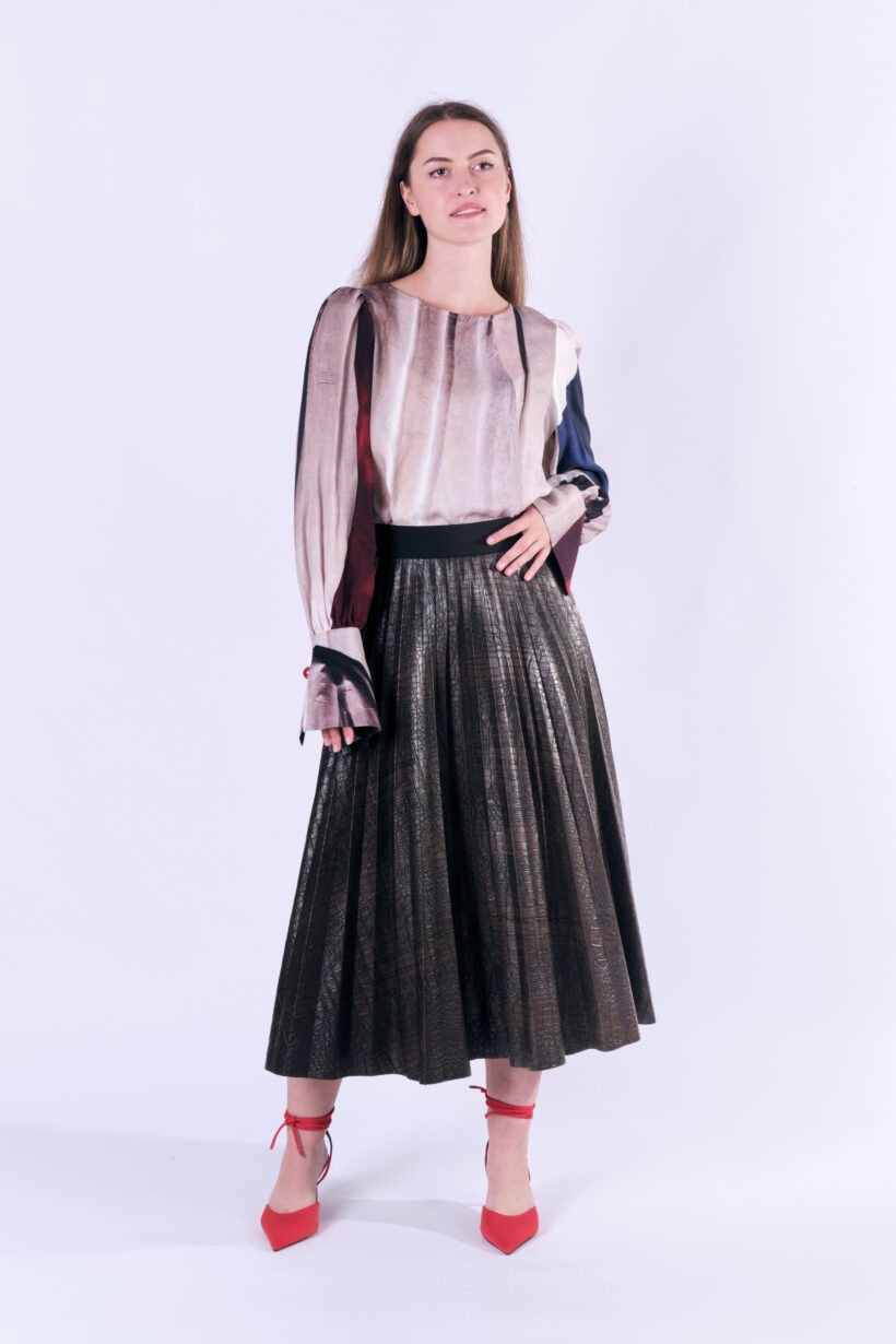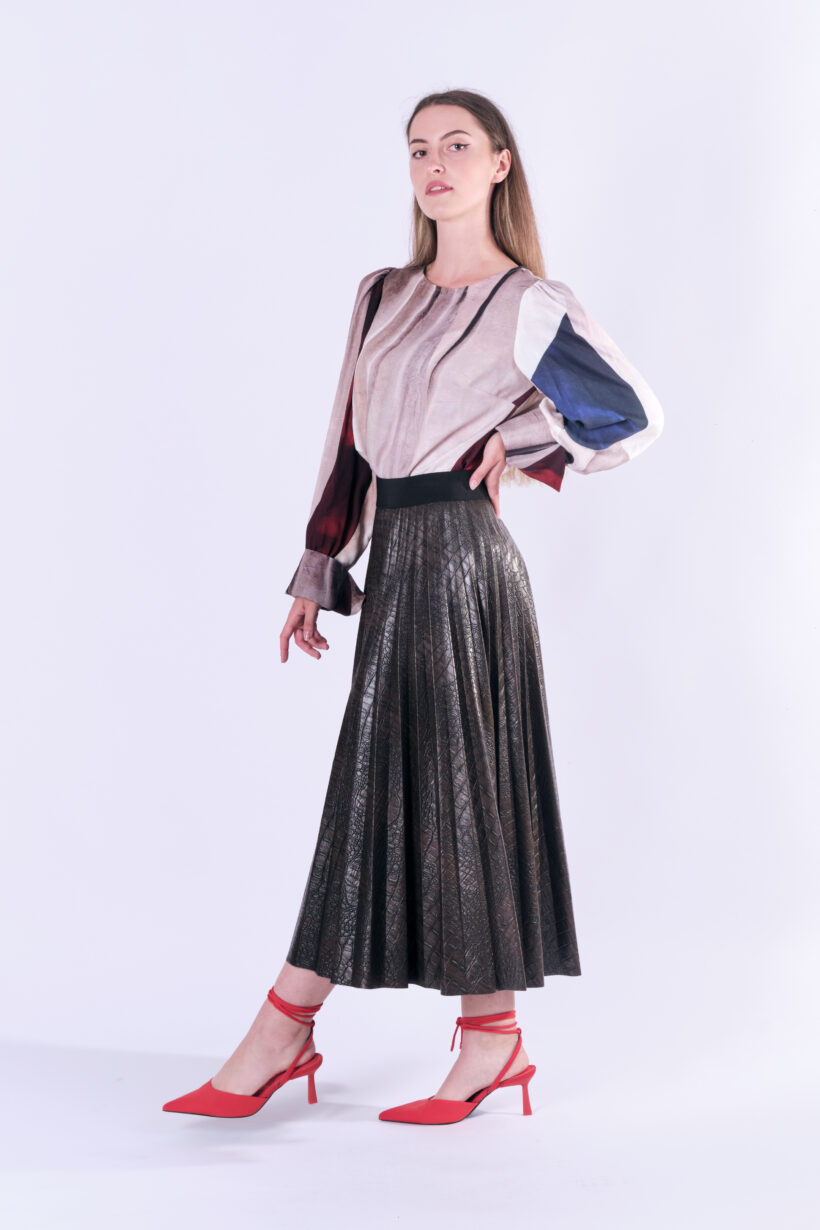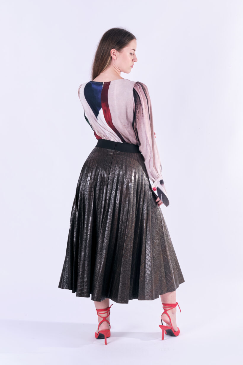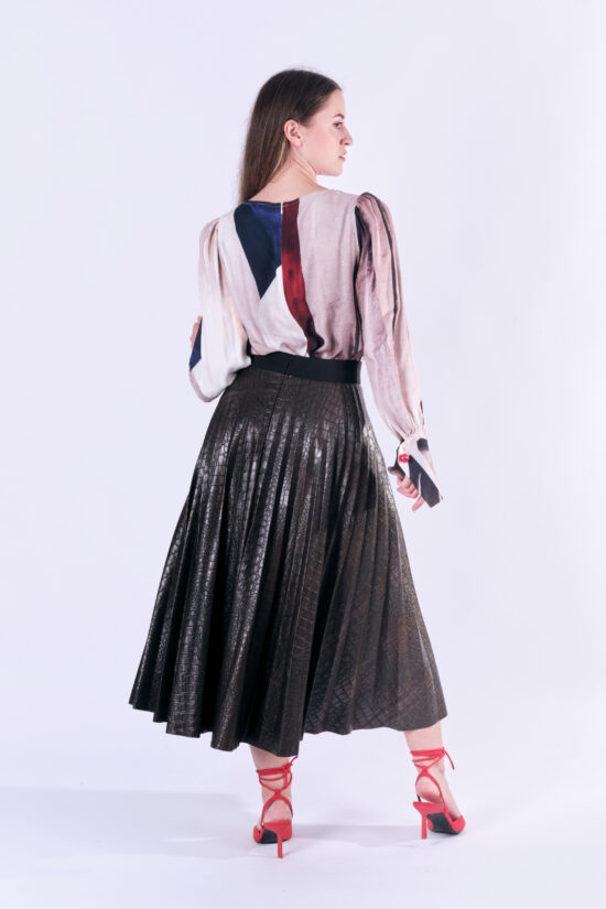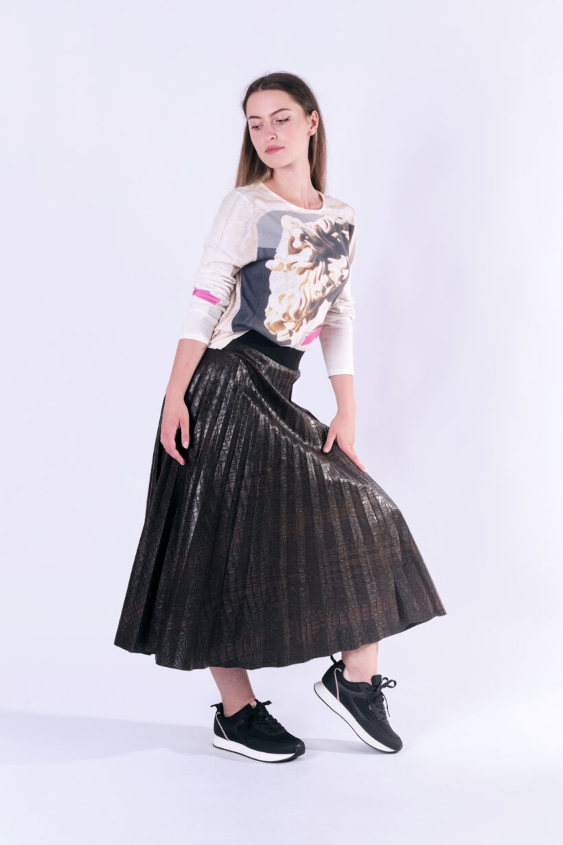 SNAKE to brązowa spodnica z eko skóry tłoczonej we wzór imitujący zwierzęcą skórę. SNAKE to solejka a więc spódnica plisowana promieniście. Plisy są węższe u góry i rozszerzają się ku dołowi. Dolny brzeg spódnicy jest cięty laserowo. Spódnica jest na szerokiej 5 czarnej, ozdobnej gumie, z tyłu ma wszyty kryty zamek. Nie ma podszewki, jest obszyta lamówką wewnątrz. Proponujemy do tej spódnicy naszą koszukę PLANT PEARL, sweter APOLLO albo któryś z naszych ciepłych swetrów: AZUR, JANTAR i QUARTZ. Taka solejka doskonale sprawdzi się w miejskiej stylizacji z mocnymi butami lub eleganckimi kozakami. Inna jej wersja to koszula i szpilki.