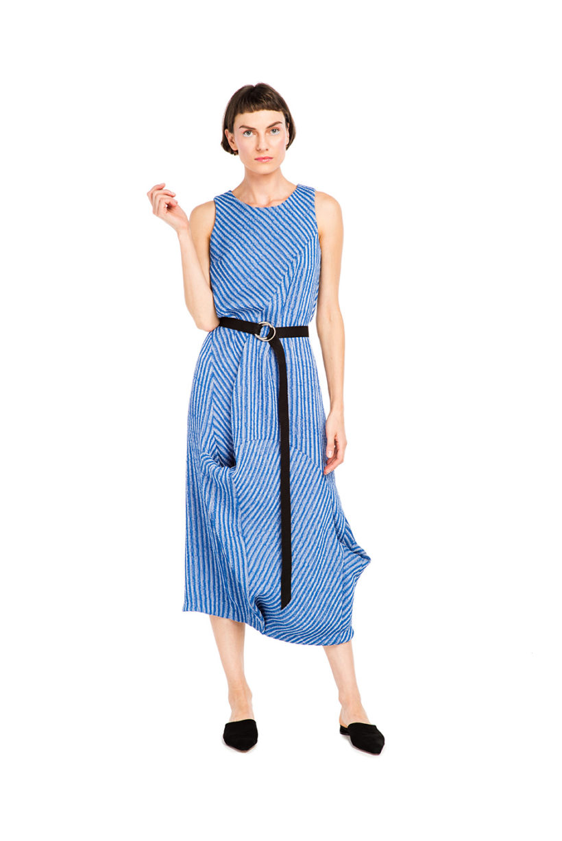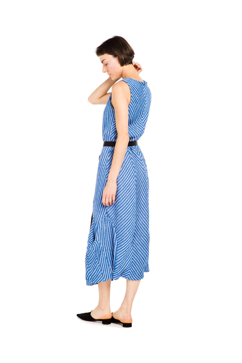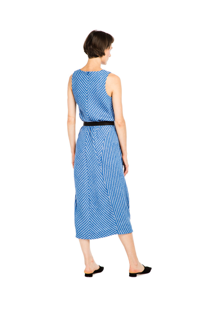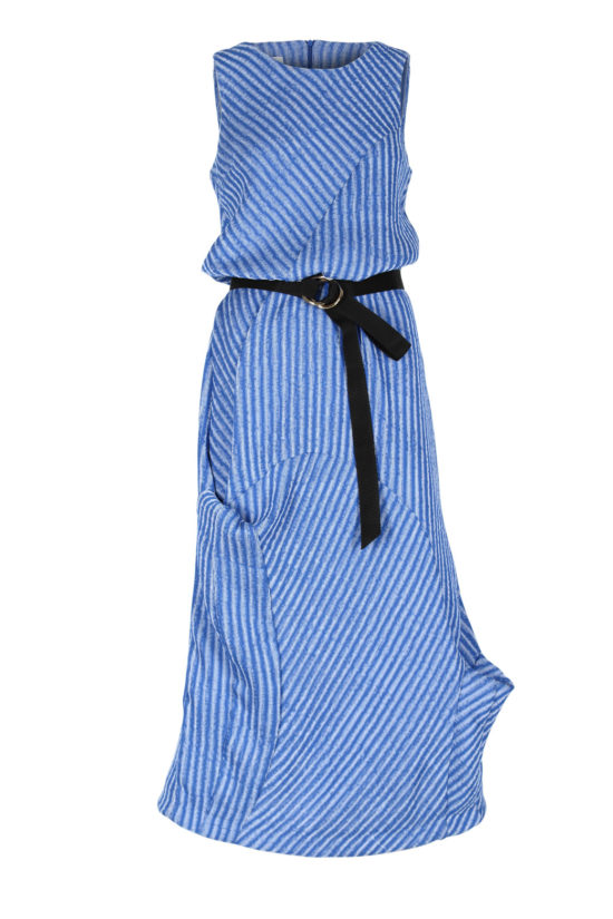 Prosta sukienka bez rękawów, której konstrukcja jest inspirowana geometrią, z przodu są dwie „kieszenie”, które podkreślają rzeźbiarskość formy. Cięcia sukienki modelują sylwetkę wykorzystując graficzny charakter tkaniny. Łódkowy dekolt podkreśla piękno kobiecej szyi, a delikatnie zawężona linia ramion nadaje lekko sportowego wyrazu. Z tyłu sukienka jest bardziej dopasowana, pośrodku ma kryty zamek. Sukienka jest są uszyta ze strukturalnej, lekko połyskującej tkaniny w niebiesko-biały (ecru) drobny prążek. Szwy wewnętrzne są lamowane.