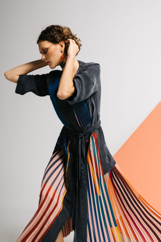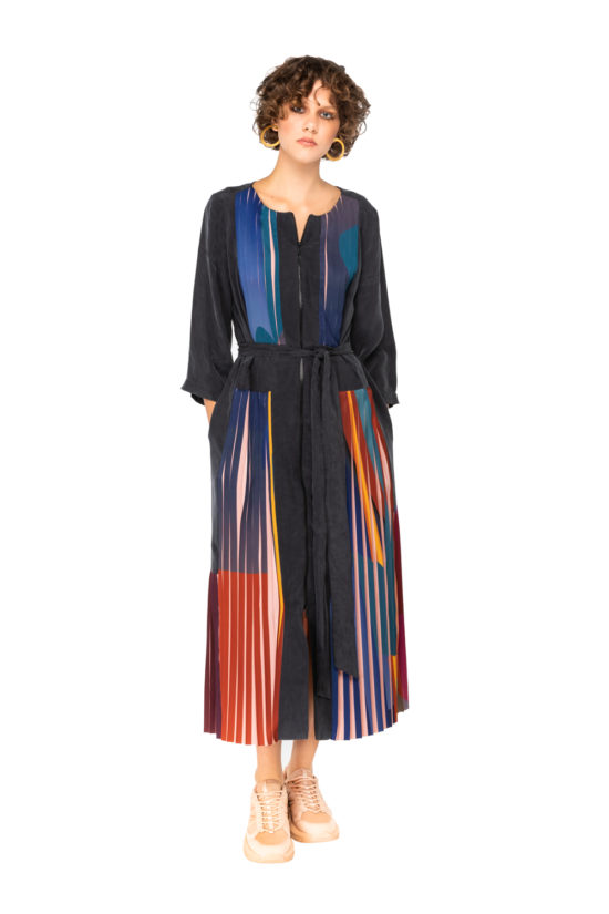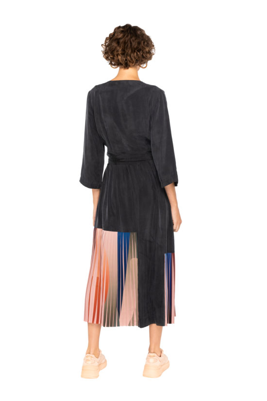 Długa, grafitowa, lekko opalizująca sukienka z rozkładającymi się na wzór wachlarza drukowanymi plisami z przodu i tworzącymi asymetrycznie geometryczne falbany z tyłu. Suknia ma dodatkowy pasek, wygodne kieszenie i jest rozsuwana z przodu. Zamek jest widoczny, jest plastikowy, czarny i ma lekko sportowy charakter, jest dwustronnie odsuwany góra – dół, czyli to Ty decydujesz jak głęboki jest dekolt i jak długi jest rozporek. Szwy wewnątrz są lamowane.