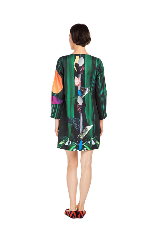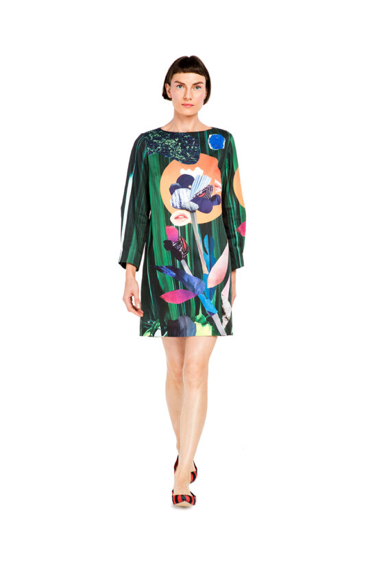 Prosta sukienka do kolana, z rękawem długości 3/4. Łódkowy dekolt podkreśla piękno kobiecej szyi. Sukienka jest uszyta drukowanego wiskozowego twillu. Nadruk stworzony techniką collague został specjalnie do niej zaprojektowany. Rękaw jest prostszy niż na zdjęciu. Szwy wewnętrzne są lamowane.