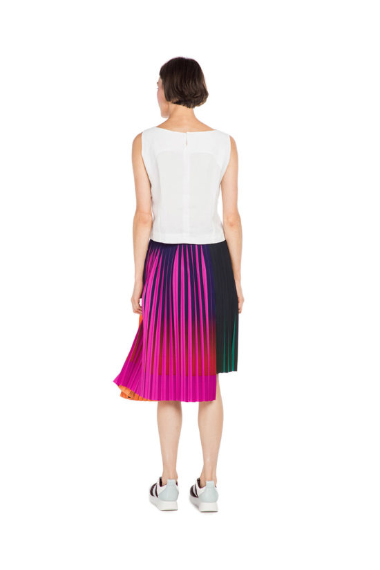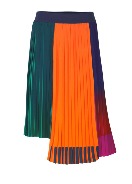Asymetryczna, plisowana i cięta laserem spódnica SUNSET nadrukowana jest w proste geometryczne cieniowane linie. Nadruk jest zrobiony na tkaninie w kolorach pomarańczy, szmaragdu i fuksji. Kiedy plisy się rozchylają widzimy niezadrukowany materiał, co daje dodatkowy przestrzenny efekt i tworzy kolejny ornament. Spódnica jest na szerokiej 5 cm granatowej, ozdobnej gumie. Nie ma podszewki, jest obszyta lamówką wewnątrz. Asymetryczne długości przed kolano i za kolano, pozwalają nosić spódnicę na rożne sposoby. Doskonale sprawdzi się podczas mniej formalnych spotkań. My proponujemy do tej spódnicy nasz top SUNRISE lub tshirt TWISTED WHITE. Doskonale sprawdzi się też ze sportową bluzą, sportowymi lub klasycznymi butami. Ale nie mówi też „nie” mocnym butom i ciepłym swetrom, kiedy tylko pora roku się zmieni.
