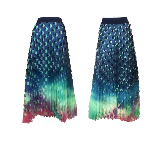 RAINBOW TINY FLOWERS to ręcznie plisowana solejka z abstrakcyjnym nadrukiem, który został nałożony na strukturalną jasnozieloną tkaninę. Wzór został zaprojektowany specjalnie do tej solejki, a jego kolory nie są wcale takie oczywiste, dzieje się tak przez delikatną transparentność tkaniny, przez którą jest lekko widoczna błękitna podszewka. To wpływa na kolor nadruku. Tam gdzie materiał jest podwójny, kolor jest intensywniejszy i nieprzefiltrowany przez kolor podszewki. Dominujący w nadruku odcień to granat, skontrastowany z zimną zielenią i gamą nieoczywistych czerwieni. Solejka to spódnica plisowana promieniście. Plisy są węższe u góry i rozszerzają się ku dołowi. Dolny brzeg spódnicy jest cięty laserowo. Spódnica jest na szerokiej 5 cm granatowej, ozdobnej gumie, z tyłu ma wszyty kryty zamek. Ma wiskozową podszewkę, jest obszyta lamówką wewnątrz. Proponujemy do tej spódnicy ecru top BLUE CIRCLE albo naszą oversizową bluzkę TWISTED WHITE lub jej czarną wersję. Taka solejka doskonale sprawdzi się w miejskiej stylizacji z mocnymi butami lub delikatnymi sandałami. Inna jej wersja to elegancka koszula i szpilki.