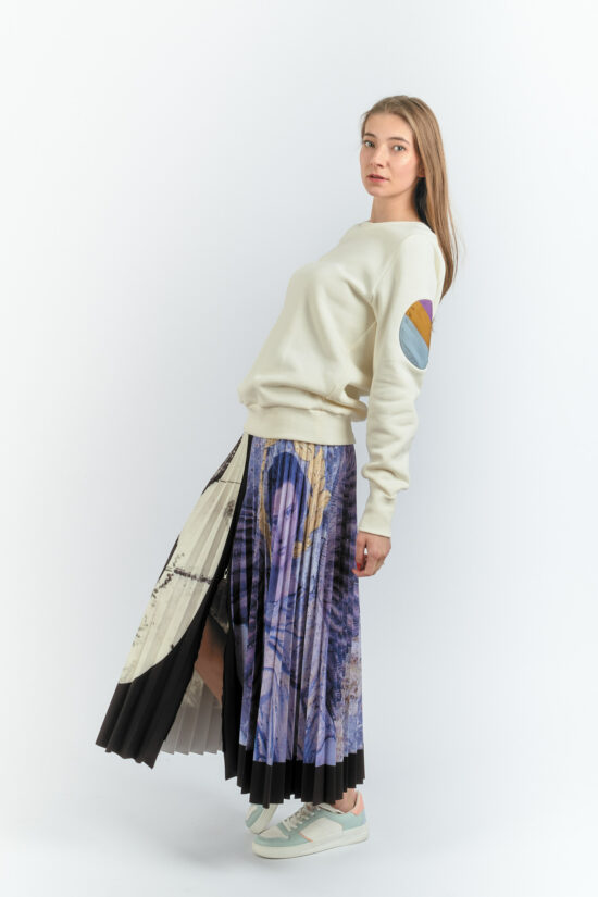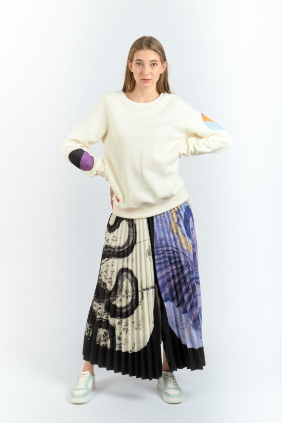 Długa, plisowana i cięta laserem spódnica drukowana jest w tworzące gradient czerń i biel. Dodatkowo na cieniowanym tle pojawiają się pasy kontrastowych kolorów. Nadruk jest zrobiony na tkaninie ecru. Kiedy plisy się rozchylają widzimy niezadrukowany materiał, co daje dodatkowy przestrzenny efekt i tworzy kolejny ornament. Spódnica ma w pasie wszytą w tkaninę gumę. Nie ma podszewki. Długa spódnica na jesień, czemu nie? doskonale sprawdzi się w mniej formalnych okolicznościach. My proponujemy do tej spódnicy nasz dopasowany golf z imitującej skórę tkaniny. Doskonale zagra ze sportową bluzą, zawsze modną białą lub czarną koszulą i klasycznymi butami. Ale nie mówi też nie mocnym butom i ciepłym swetrom, eleganckim płaszczom i “skarpetowym” botkom. My zachęcamy Cię do eksprymentowania z modą.