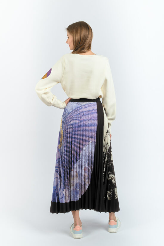 Delikatnie oversizowa bluza z organicznej bawełny i z kolorowych kół z cienkiej plisowanej tkaniny w kolorze szarego błękitu. Splisowana tkanina jest drukowana, co daje dodatkowy wzór. Bluza ma okrągły dekolt co nadaje delikatnie jej bardziej sportowego charakteru. Ma też obszerniejsze rękawy z klasycznym mankietem. Wykończona jest ściągaczami. Bluza fantastycznie sprawdzi się z naszymi plisowanymi spódnicami, chętnie dopasuje się do dżinsów.