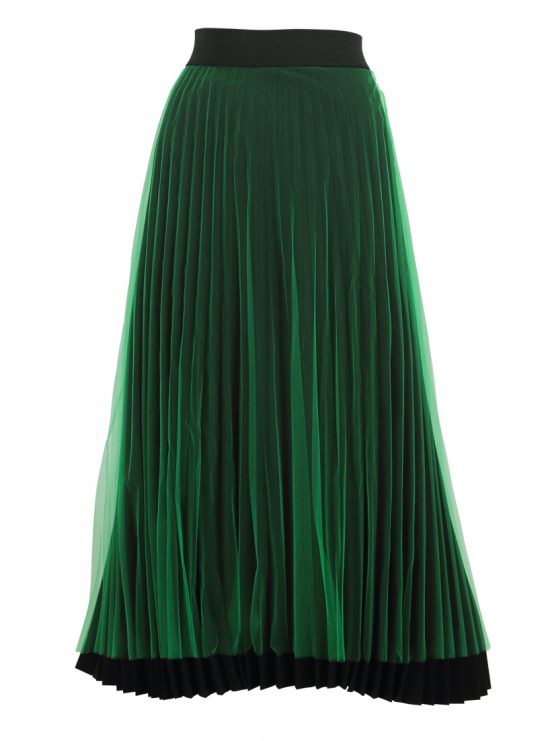 VERDE SOLEJKA to czarna solejka z zielonym splisowanym tiulem. Solejka to spódnica plisowana promieniście. Plisy są węższe u góry i rozszerzają się ku dołowi. Dolny brzeg spódnicy jest cięty laserowo. Spódnica jest na szerokiej 5 cm czarnej ozdobnej gumie, z tyłu ma wszyty kryty zamek. Nie ma podszewki, jest obszyta lamówką wewnątrz. Tiul jest 5 cm krótszy niż spódnica i ze względu na lekkość materiału też inaczej się układa. My proponujemy do tej spódnicy naszą oversizową bluzkę TWISTED BLACK lub TWISTED WHITE. Taka solejka doskonale sprawdzi się w miejskiej stylizacji z mocnymi butami i wiosennym płaszczem lub kolorową kurtką bomberką. Inna jej wersja to elegancka koszula, szpilki i wielkie wyjście. Solejka VERDE roztacza przed tobą swoje niemal nieograniczone możliwości.